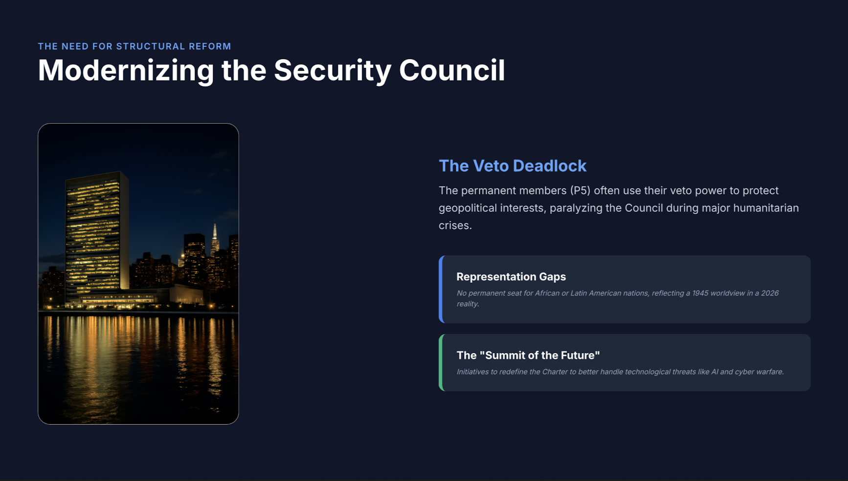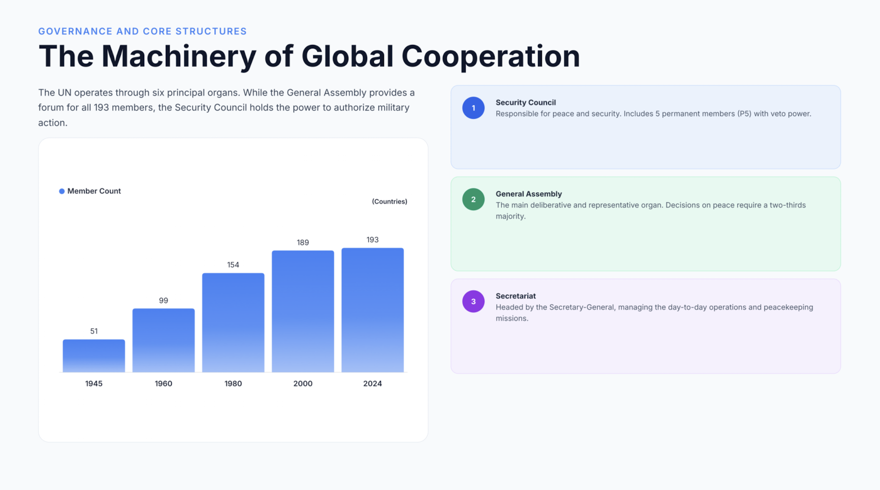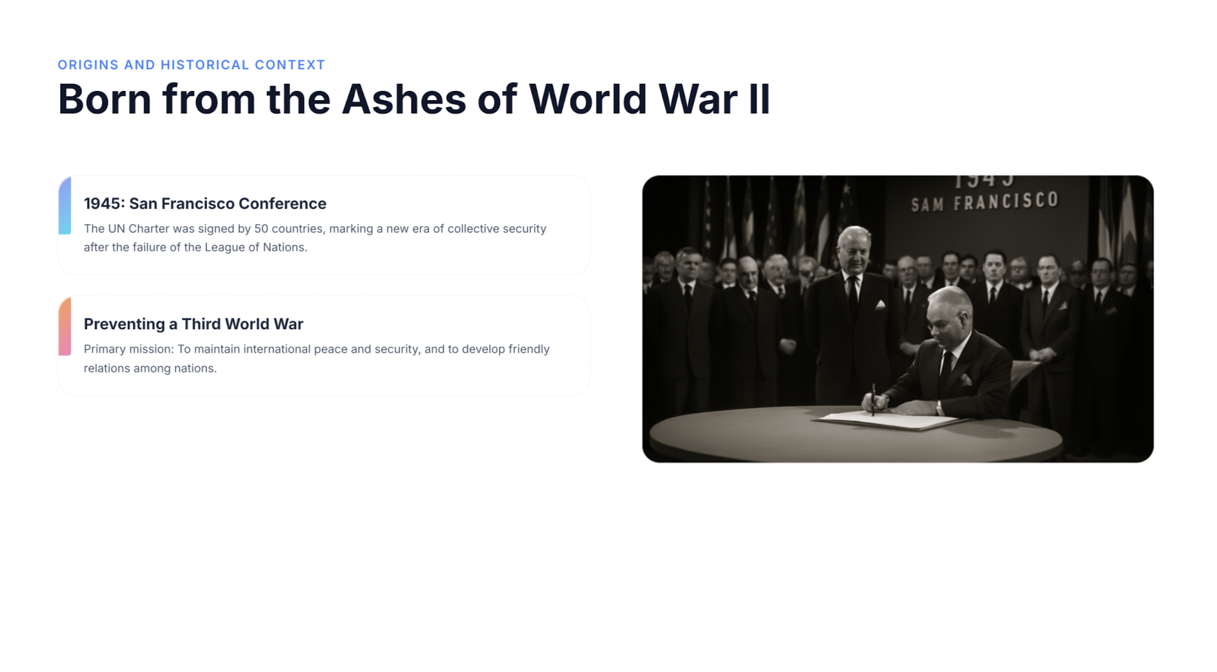 “Prepare a presentation document detailing the history of the United Nations and the current issues it faces.”